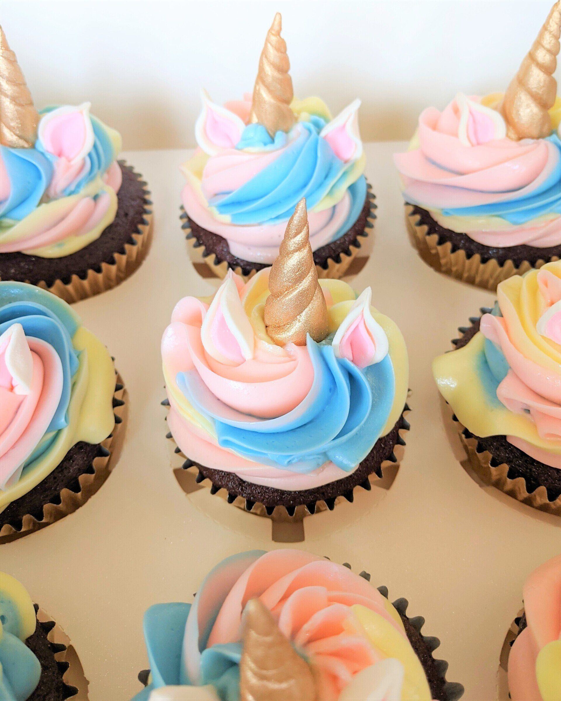 Adorable unicorn cupcakes using Italian meringue buttercream in pink, blue, and yellow. Decorated with handmade gold covered fondant horns and white and pink ears.
