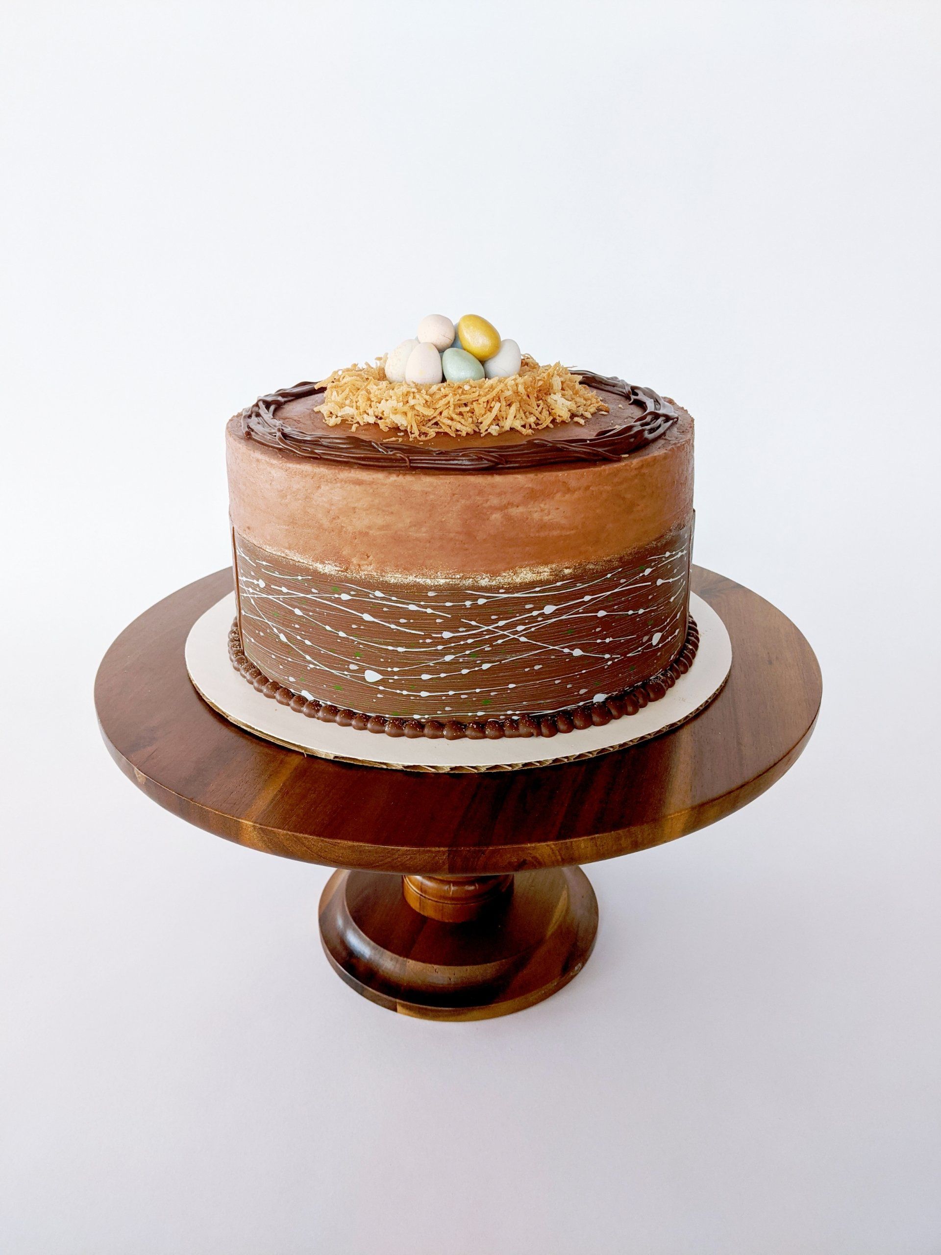 Triple Layer 10" round cake. Three different color layers (Yellow, Pink, and Blue) white cake. With chocolate American buttercream. Decorated with chocolate ganache, chocolate transfer sheet, toasted coconut shavings and Cadbury chocolate eggs..
