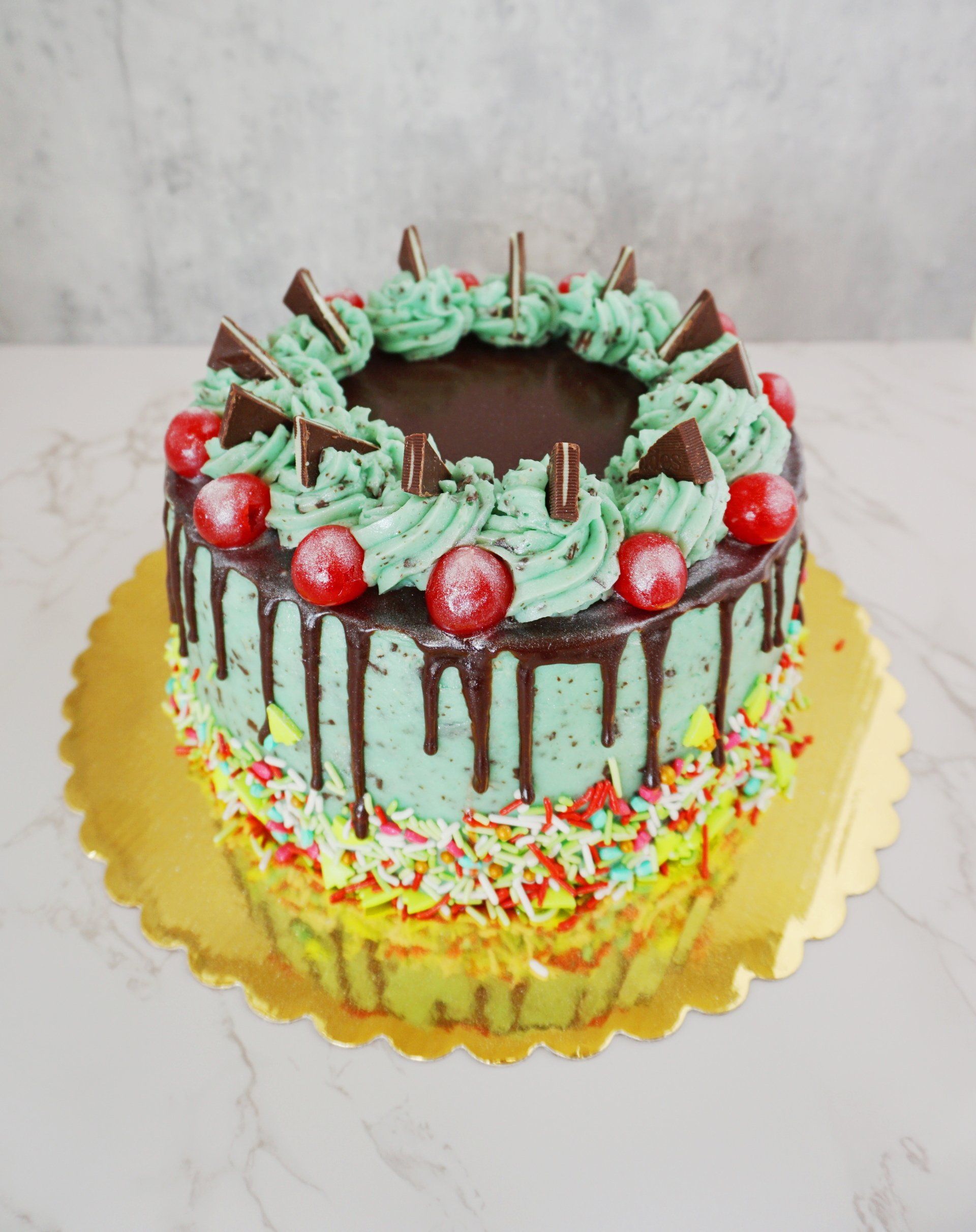 Triple Layer 8" Round mint chocolate cake with Andes mint Swiss meringue buttercream. Decorated with sprinkles, chocolate drip, and jarred cherries. Garnished with edible glitter and cut Andes chocolate.