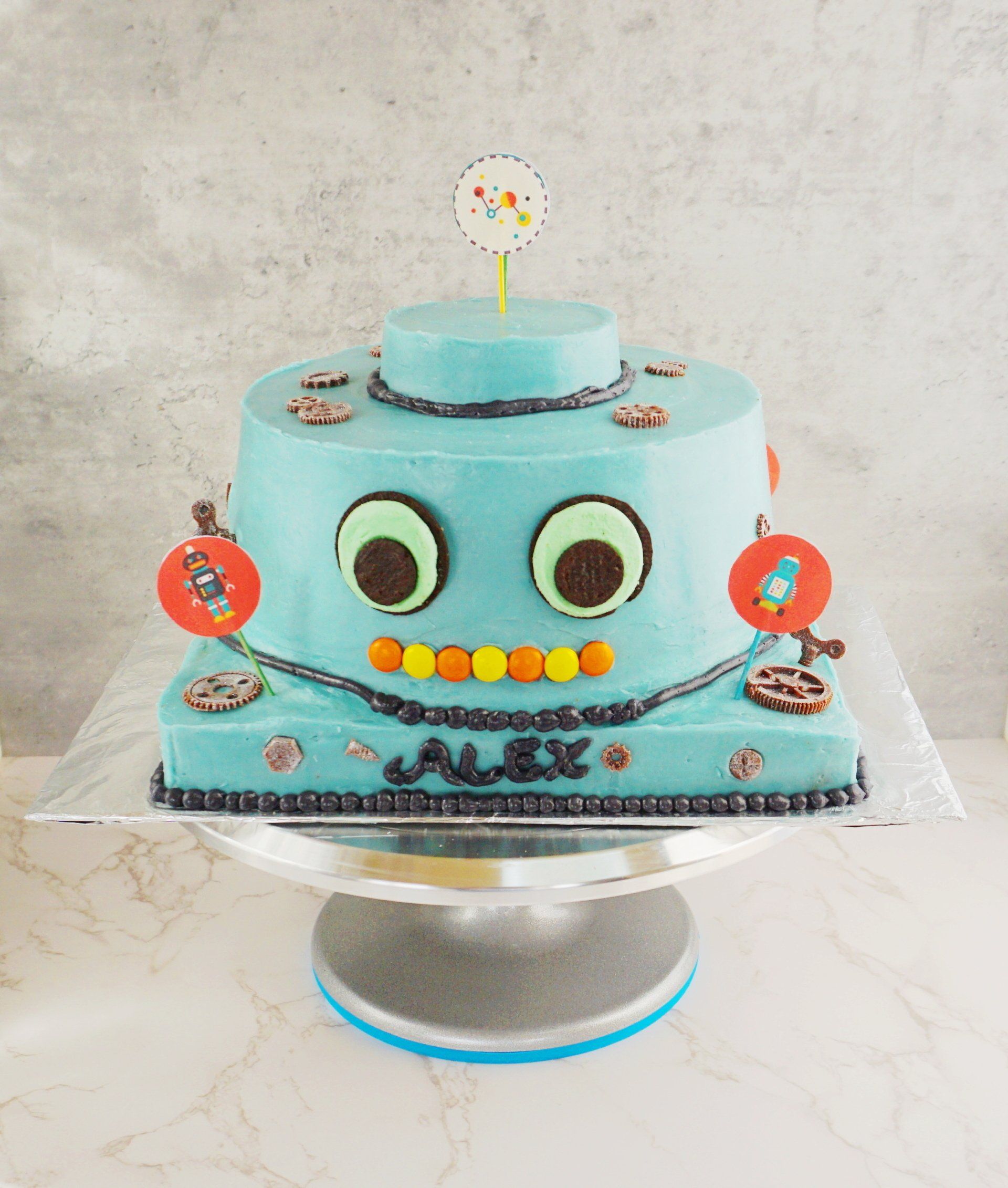 1/4 Sheet cake with 10" round double layer cake hollowed out 4" round to hide M&M's and a toy robot for a surprise when cutting. Vanilla cake with vanilla Swiss meringue buttercream. Decorated with chocolate gears, and bolts, Oreo eyes, M&M mouth and paper toppers.