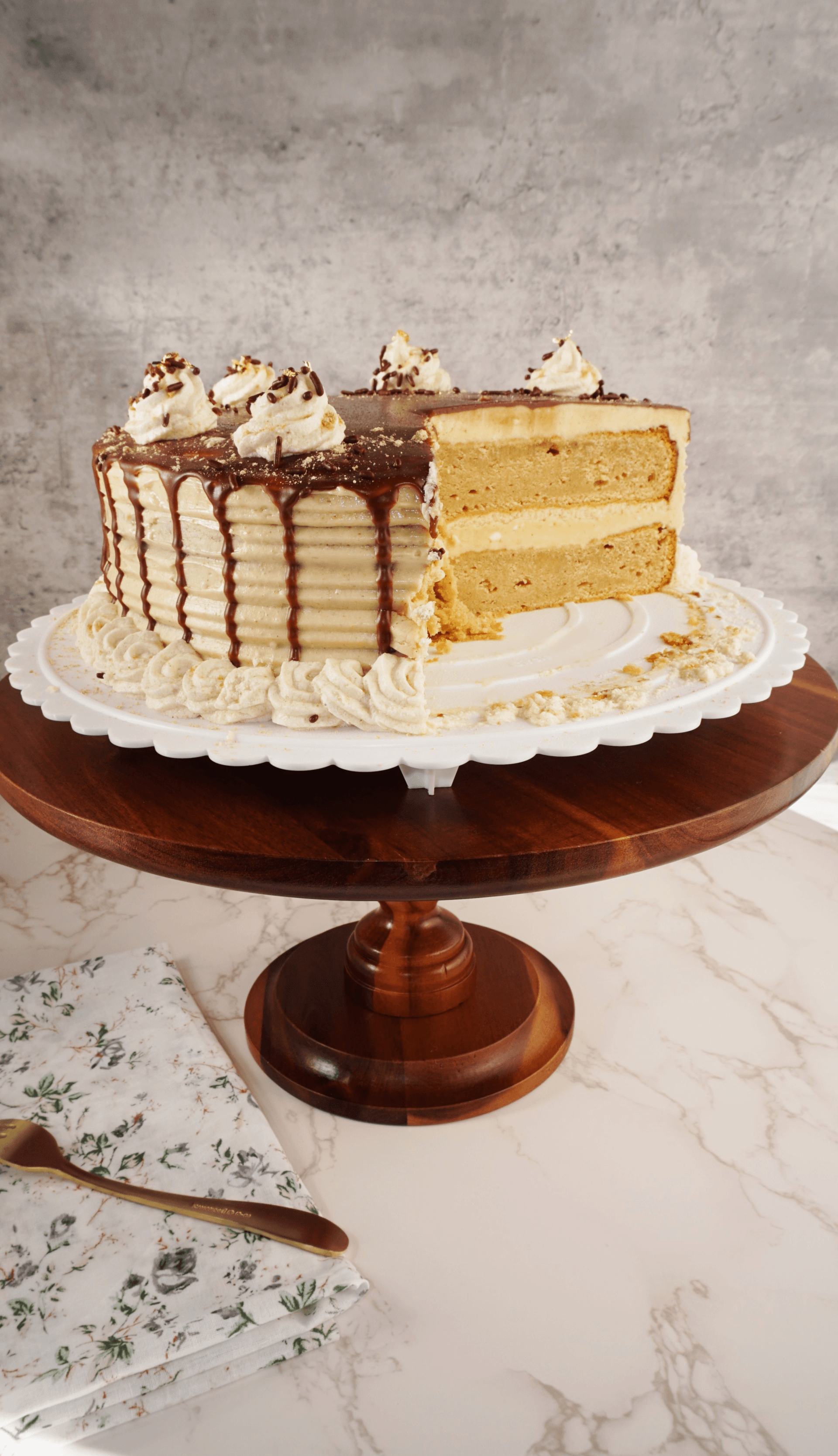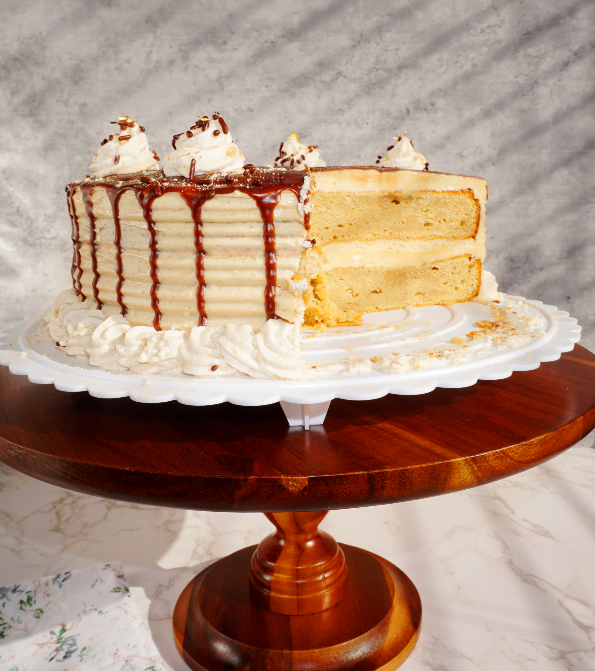 Double Layer 10" Round peanut butter cake with peanut butter buttercream frosting and chocolate drip.