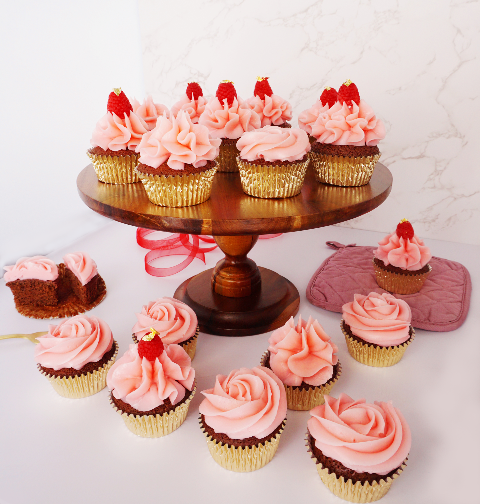 Delicious moist chocolate cupcakes, with an adapted raspberry American buttercream frosting. Garnished with fresh raspberries.